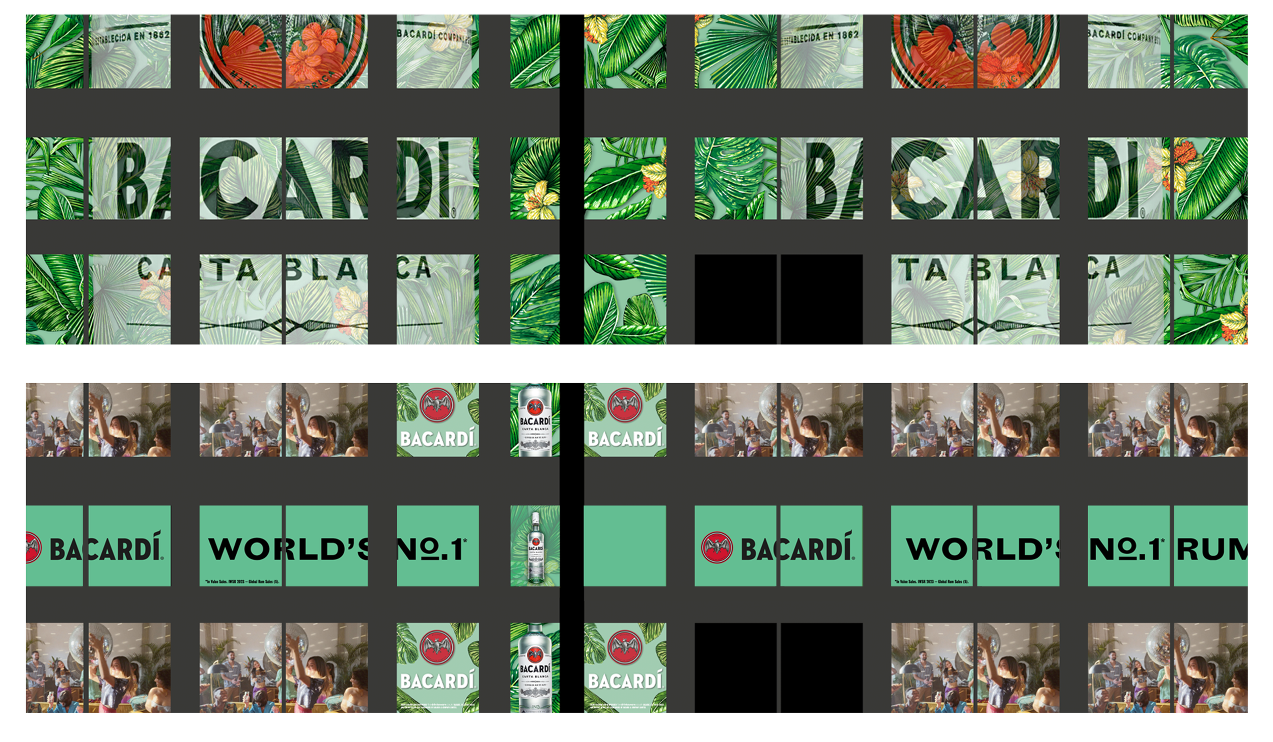 Bacardi required a high-impact DOOH placement in the run up to Christmas. They booked media at The Cube, Flannels flagship store on Oxford Street. This involved creating a dynamic 30 second ad that utilised multiple digital screens that covered the entire building, running as one complete display. Using existing Bacardi assets, a complex storyboard was created. Working closely with a motion designer, we created the final deliverable to strict production specs.