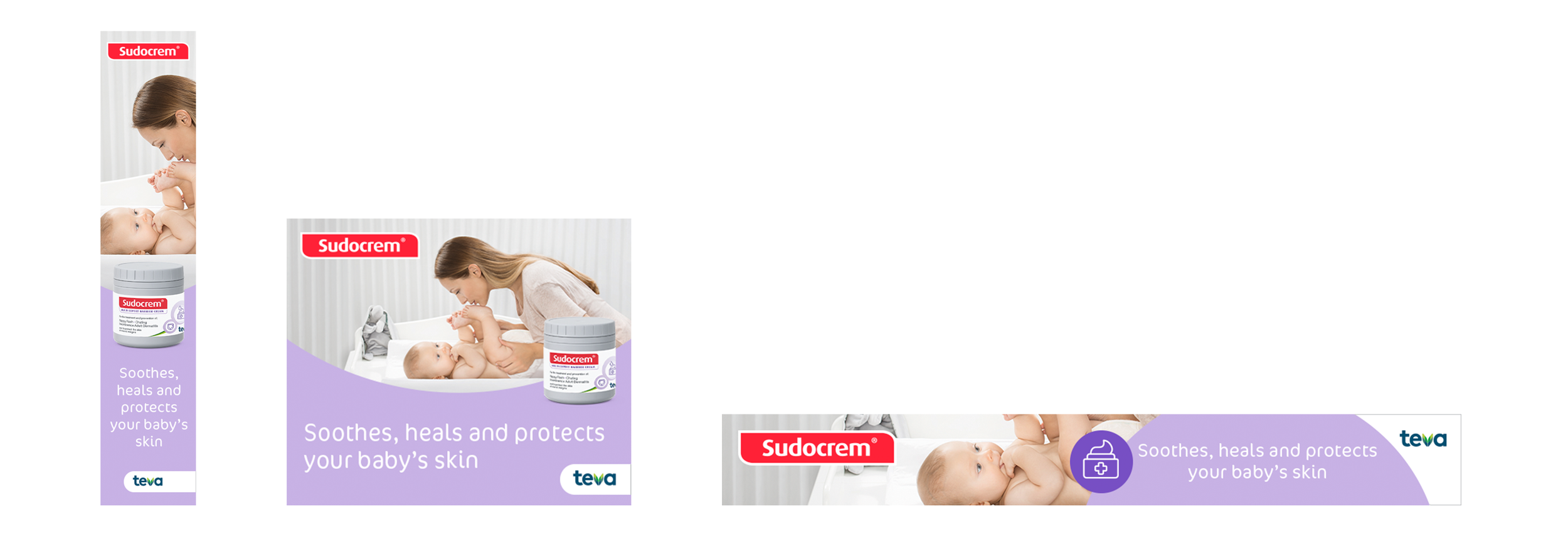 Our client, TEVA, required a toolkit of assets for Sudocrem that would be rolled out across all of their international markets that followed the brand guidelines. This included advertising templates with placeholder copy that would accommodate varying amounts of content that were easy to recreate across multiple languages along with a range of static banners and social posts. I also created a library of stock imagery that covered various age groups of the target market and ensured diversity across all possible markets. Working with a copywriter, we also created a bank of sign-offs, headlines and content that could also be easily translated for localisation.